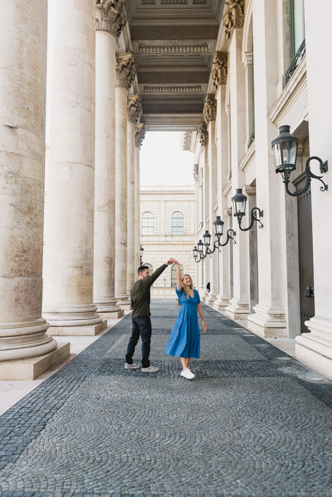 We kicked things off at Max-Joseph-Platz, with the grand Bavarian State Opera as our backdrop, then wandered past the stunning facade of the Munich Residenz. From there, we strolled down Residenzstraße, made a stop by the cobbled corners of Perusastraße, and wrapped up with soft morning light spilling over Odeonsplatz. There were laughs, a bit of twirling, and just the right amount of “let’s see where this leads.”